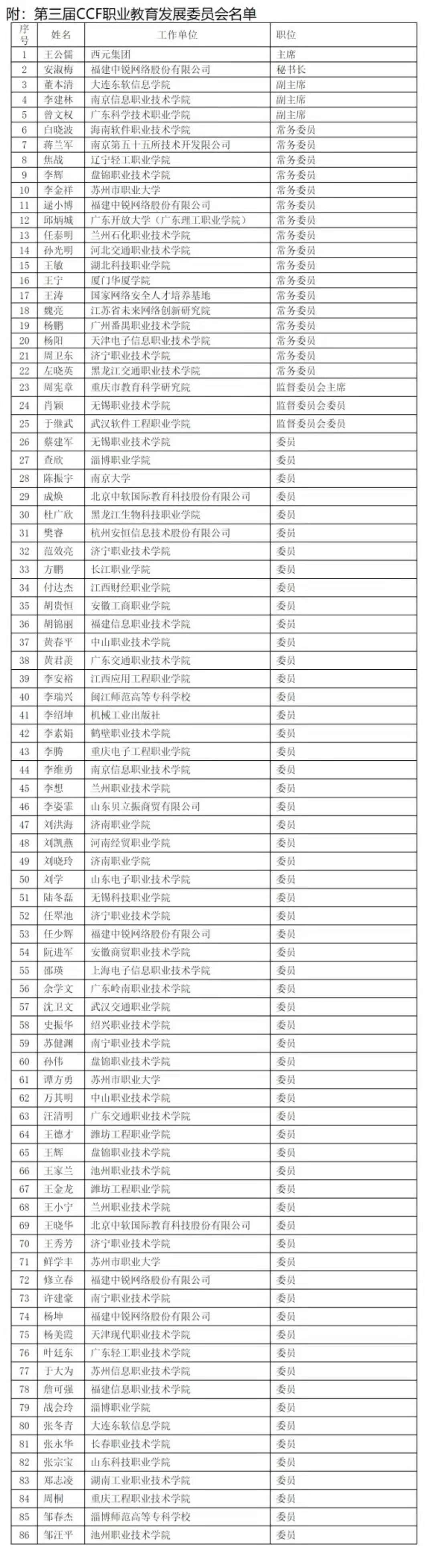 第三届CCF职业教育发展委员会名单